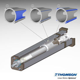 Thomson löst dieses Problem, indem zwei gegenüberliegende Führungsstege etwas flacher konstruiert wurden als die übrigen beiden (③). Auf diese Weise entsteht ein gerade ausreichend großer Luftspalt, der einen Druckaufbau vermeidet.