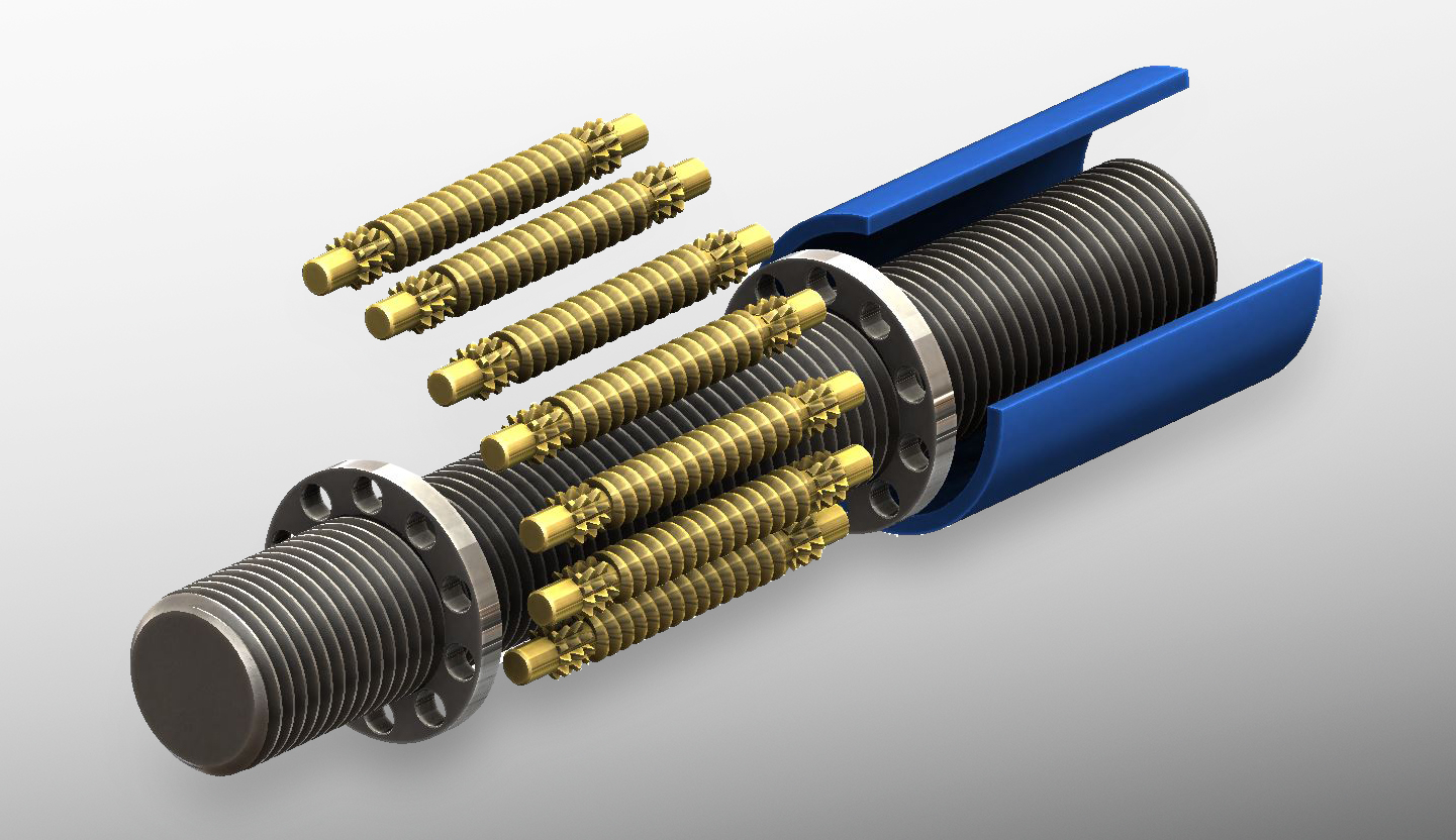 For higher loads, design engineers have specified roller screws into many applications. In a roller screw, the load bearing mechanism is a set of recirculating rollers instead of balls. The rollers have more total surface contact area than balls, which increases the load carrying capacity and can also increase service life.