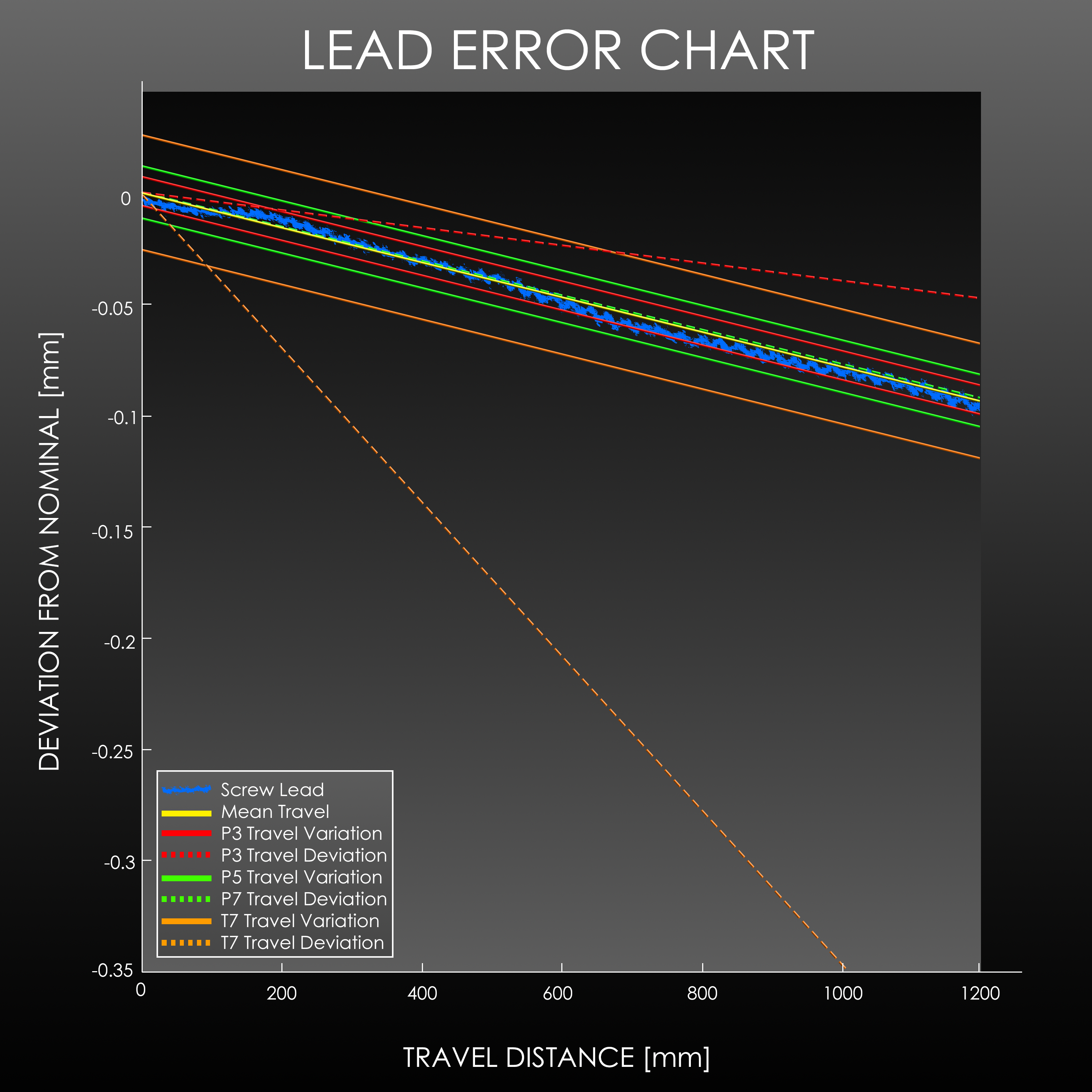 Revealing and quantifying this error can be challenging, even for the manufacturer, as expensive and specialised analysis equipment is necessary but not commonly available. Therefore, many manufacturers must rely on manual, individual measurements versus dynamic, continuous measurements that measure and record 100% positional accuracy throughout full travel. For example, a Ø12 mm ball screw with a 2 mm lead has 150 pitches over 300 mm and may require more than 600 measurements to accurately portray the screw characteristics.