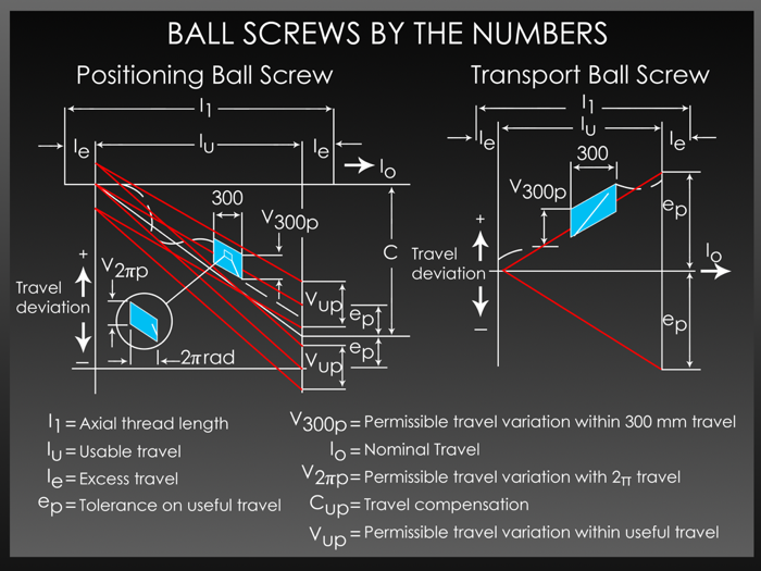 Guided by ISO, DIN & JIS industrial standards (See Figure 2), many design engineers broadly define lead accuracy of ball screws only in terms of error accumulated over 300 mm (V300) but often overlook the value of measuring or controlling lead accuracy per revolution (V2π). Often referred to as ball screw drunkenness because of the hard-to-predict wobble it introduces into ball screw operation, lead accuracy per revolution is emerging as a critical parameter in miniature screw applications where the overall travel length is less than 300 mm.