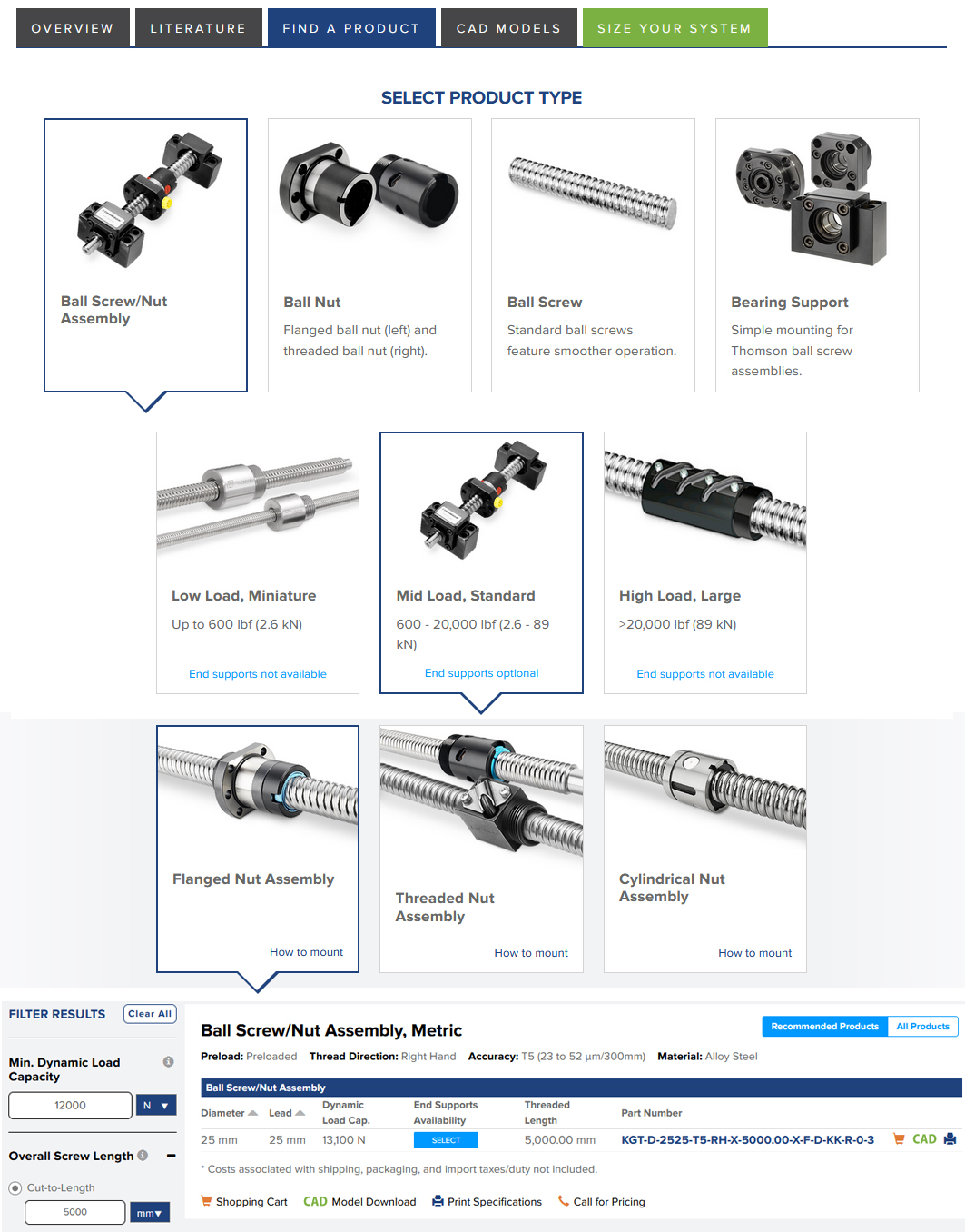Mit dem intuitiven Online-Produktauswahl-Tool können Benutzer schnell und einfach den optimalen Thomson finden Kugelgewindetrieb für ihre Anwendungen