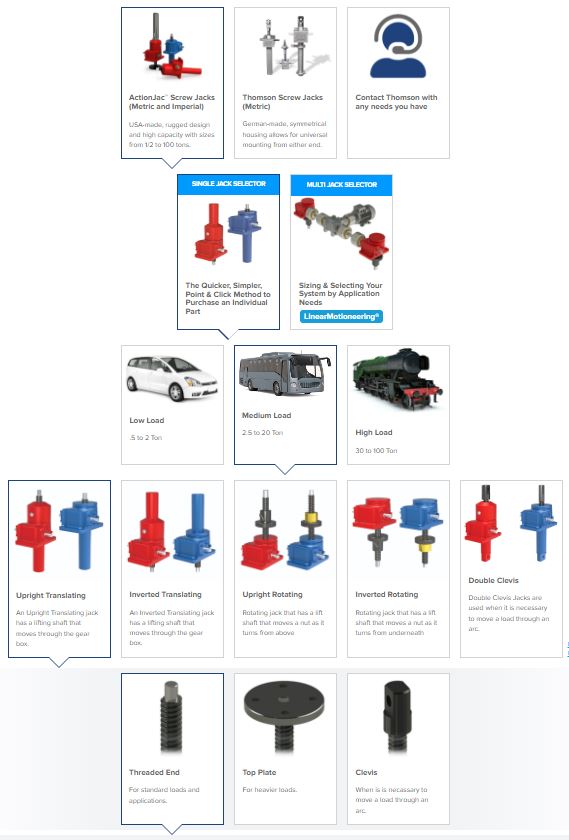 DOWNERS GROVE, IL - Thomson, a leading global provider of linear motion control solutions, has added a unique screw jack configuration and selection tool to its online engineering toolset. The new Thomson screw jack product selector helps design engineers optimize and specify screw jacks for applications involving loads of up to 100 tons.