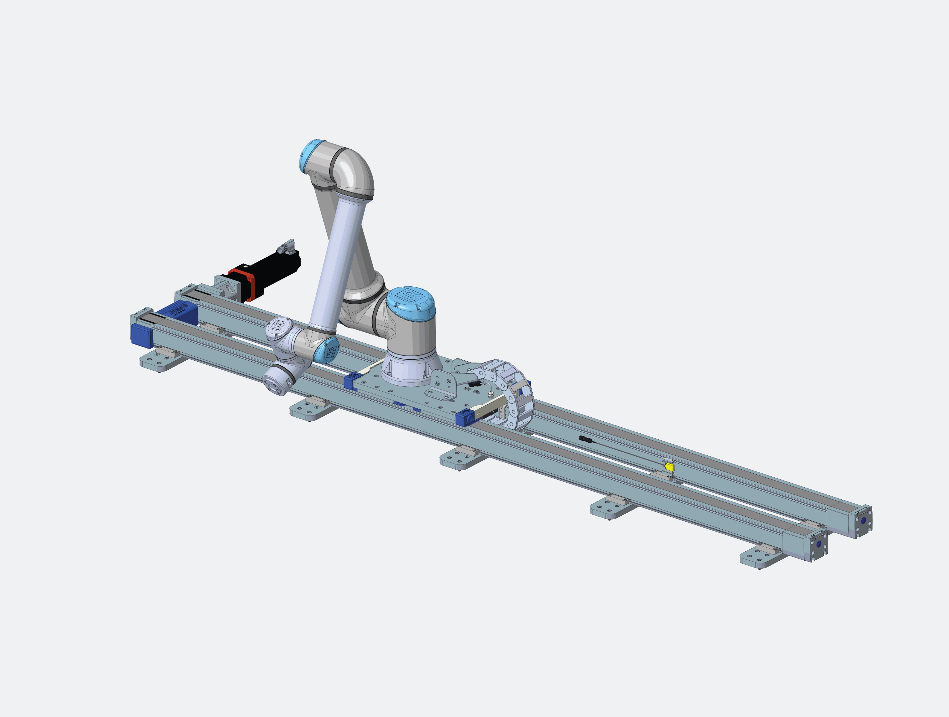 Die auch als Reichweitenverlängerung bezeichnete Thomson MovoTrak CTU verfügt über einen Kollmorgen-Servomotor sowie Führungsschienen mit Lineareinheiten, um eine Cobot-Baugruppe zwischen mehreren Bearbeitungsstation zu bewegen. Allerdings enthält die MovoTrak CTU im Unterschied zu allen anderen 7. Achsen eine Kollisionserkennung ähnlich der eines Cobot-Gelenks. Während des Setups müssen die Anwender lediglich die Empfindlichkeit der Kollisionserkennung auf einem Bedientablet einstellen – der Motor-Frequenzumrichter übernimmt anschließend zusammen mit der digitalen E/A die Kollisionsüberwachung und das Stoppen des Cobots.