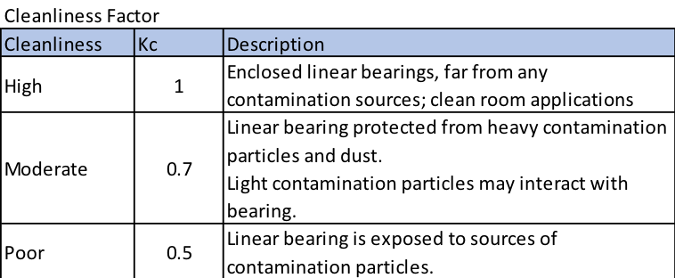 Example 1: For a bottle company, assume they have automated equipment that uses Thomson Super Smart bearings at 1557 N force-applied load and a speed of 2.3 m/s. Linear bearing operating temperature is below 70°C. Application cleanliness is considered high.