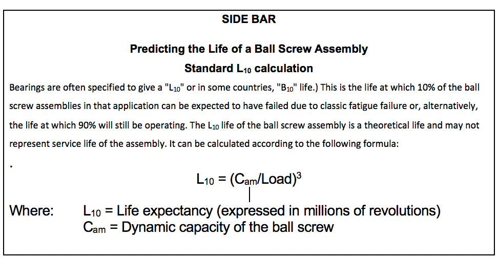 Thomson Industries has developed a high-load ball screw by implementing a unique thread form that increases load-bearing capacity four to eight times over traditional ball screws. This gives the application engineer the option of deploying a ball screw in most any application that previously required a roller screw. Or, because the life of the assembly is a direct function of the load capacity (See Side Bar L10 Life Expectancy Calculation), using a high-load ball screw in a low-load application would extend the life of the product.