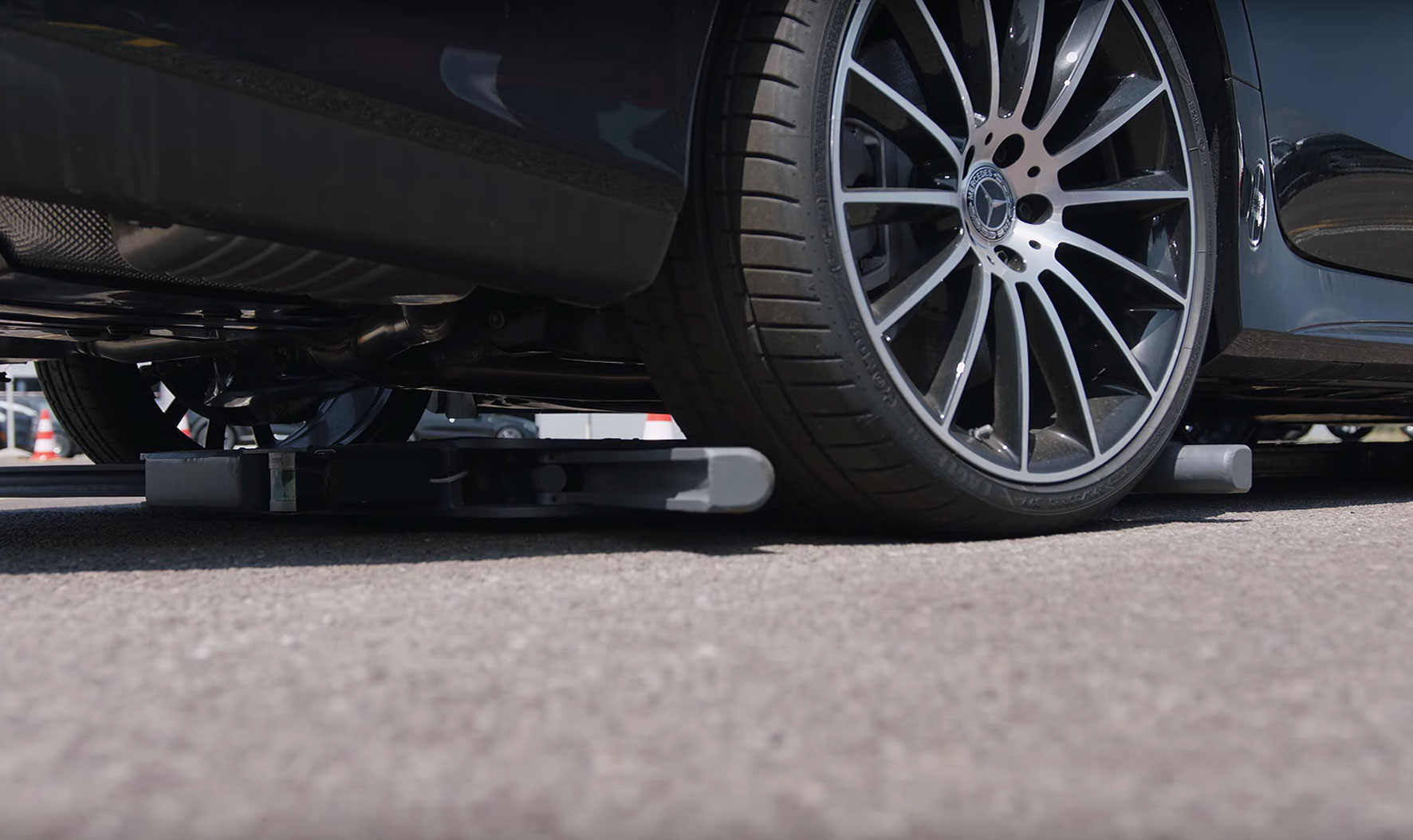 Before lifting the vehicle, it must be secured onto the platform. Stanley Robotics accomplishes this with pliers that close in under each tire. When the robot first slides the platform under the car, all pliers except the two closest to the robot head are retracted so that the platform can clear the width of the wheels. (Figure 3)