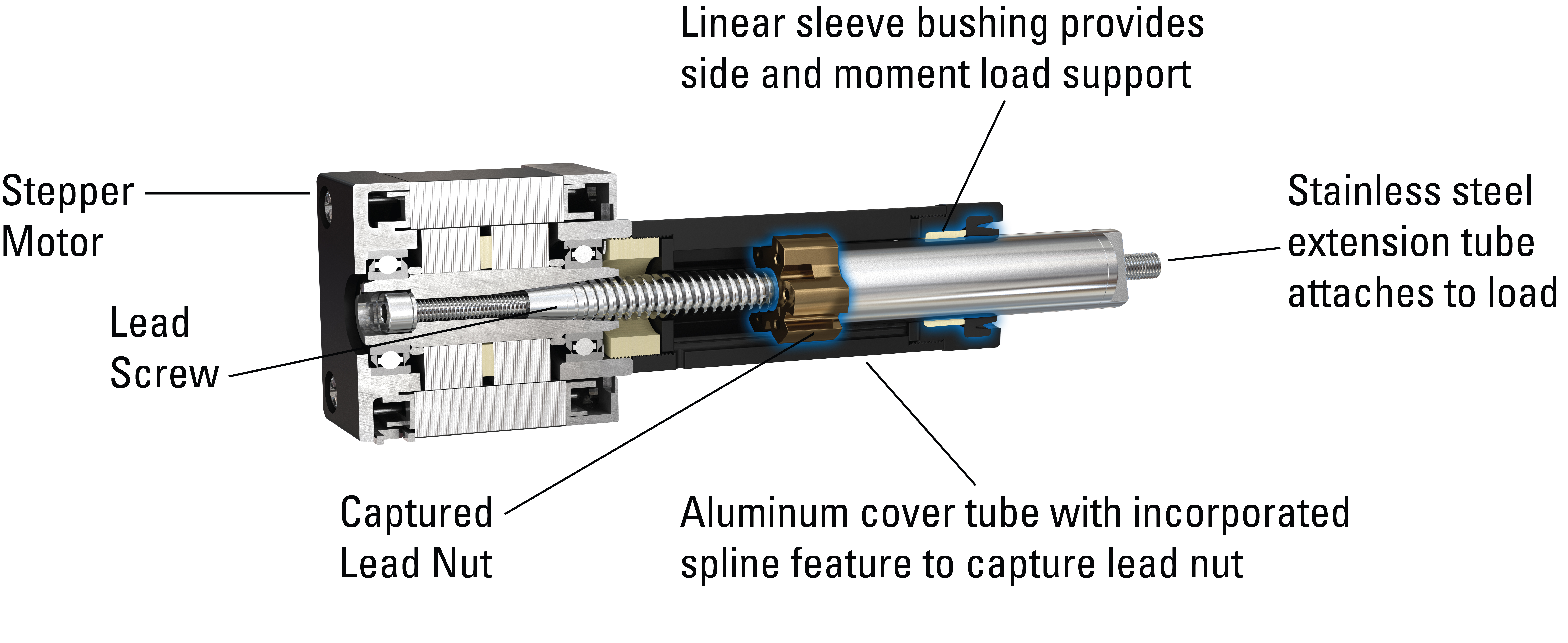 MLAs enforce guidance by utilizing a splined cover tube that completely captures the mating lead nut and prevents rotation, while allowing axial translation. The integrated linear sleeve bushing within the end-cap at the front of the cover tube provides radial and moment load support.